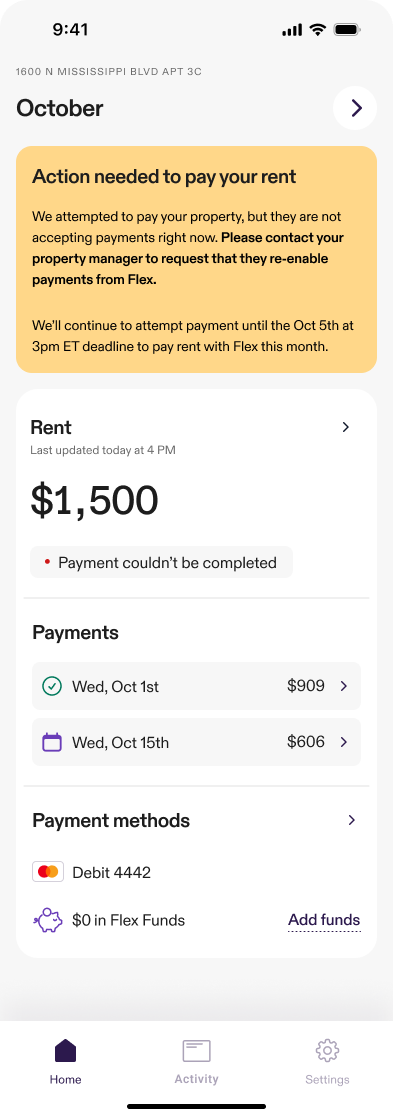 Until payments are re-enabled by your property, Flex cannot submit your rent. You’ll receive a notification via email, text, or push, and you’ll also see a message in the Flex app explaining what to do next.